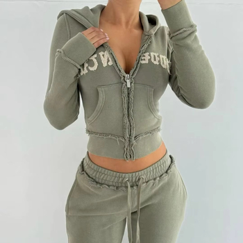 Bộ đồ thể thao nữ 2 món gồm áo hoodie ngắn tay có mũ và quần jogger chất liệu khăn thêu logo tùy chỉnh, kiểu dáng xù, khóa kéo toàn thân, mềm mại